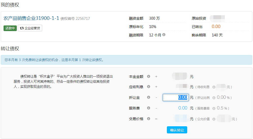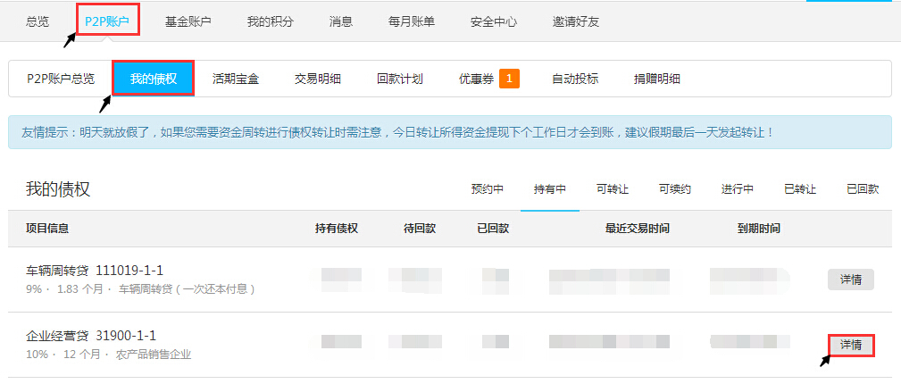 1. 点击p2p账户——我的债权,点击要转让项目右侧的详情按钮