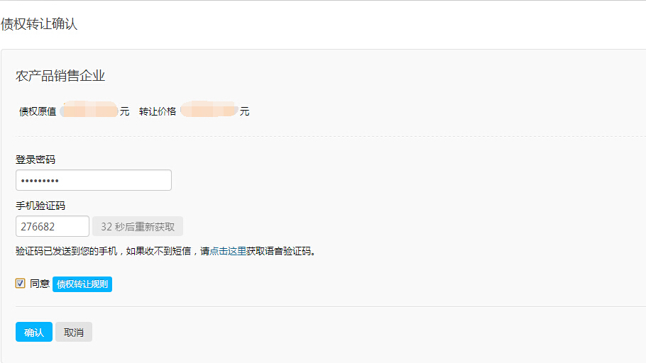 5. 输入登录密码及手机验证码,查看并同意债权转让规则后点击确认